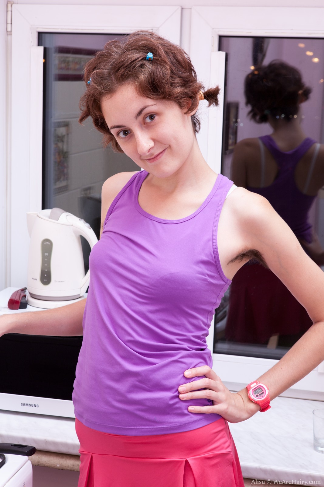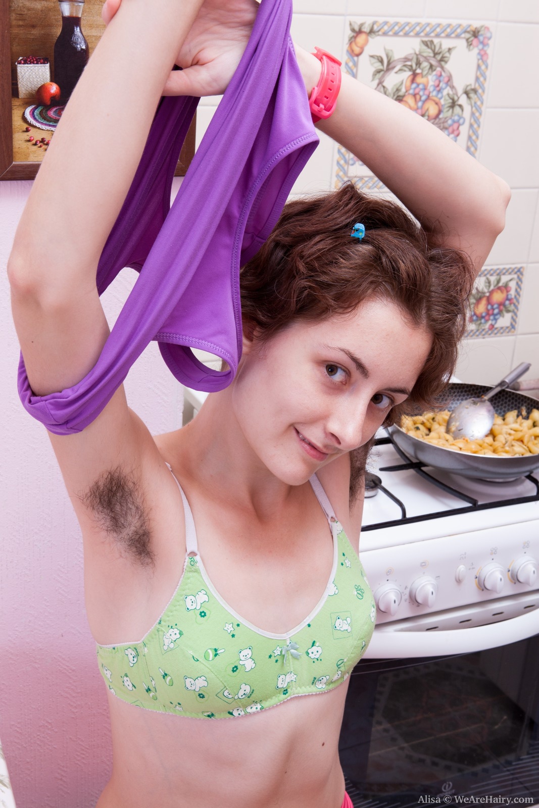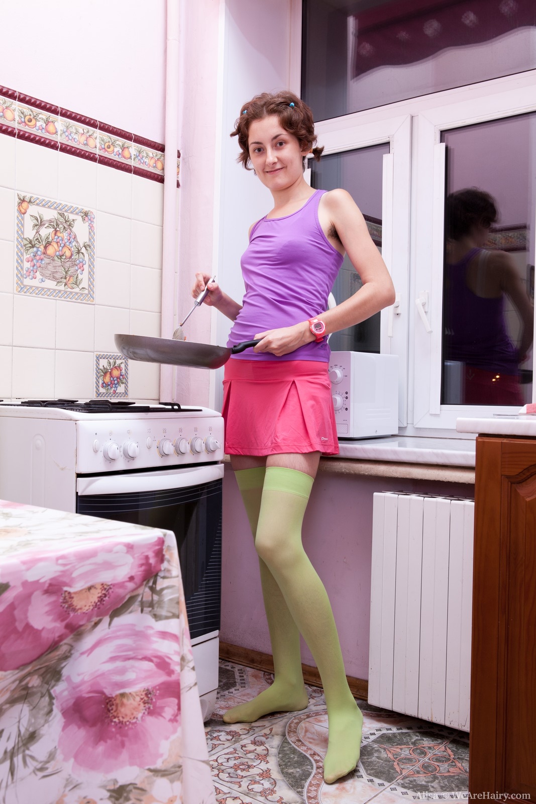Hairy girl Alisa plays while breakfast cooks