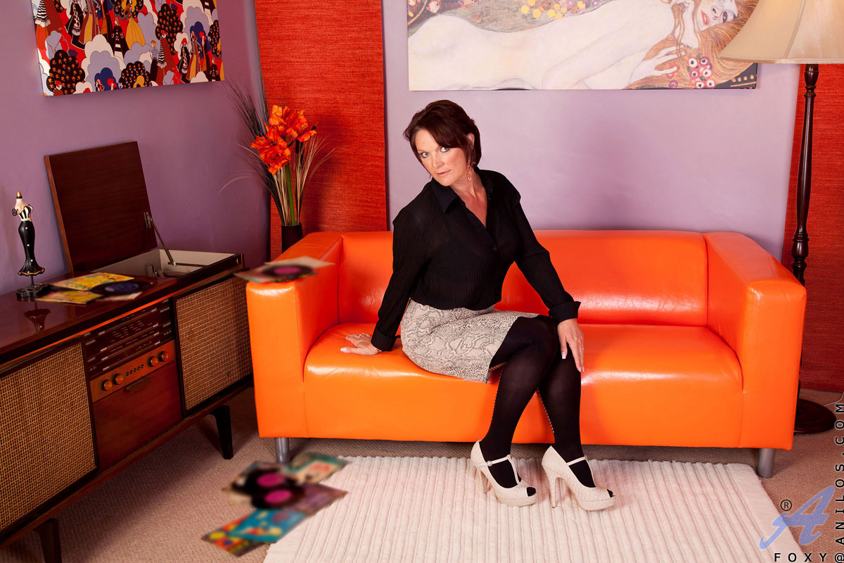 Busty mature milf Foxy bends over showing off her shaved snatch